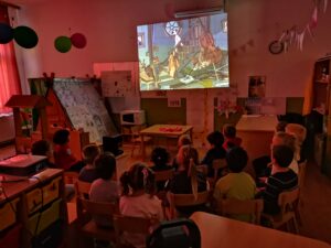 U utorak smo gledali animirani film po želji nas djece – „101 Dalmatinac“. Crtić smo povezivali s dječjim pravima jer su mali dalmatinci u crtiću kao mala djeca. I oni imaju pravo na život, pravo na hranu i dobro postupanje, na kraju su svi mali dalmatinci ostali s mamom i tatom (imaju pravo na roditelje). Poslije smo još dugo spontano crtali likove iz crtića a posebno nam je u pamćenju ostala Zlica od Opaka.