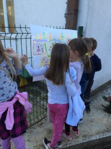 Crteže smo postavili na hamer i obložili plastičnom folijom te ga izložili na žičanu ogradu ispred vrtića. Istovremeno smo izrađivali i plakat dječja prava i obveze uz slikovni materijal. Istog dana provjeravali smo prognozu vremena te odlučili da ćemo idući dan otići u šumu i na piknik. Za to nam je potrebna starija odjeća koju možemo zamazati i čizmice.