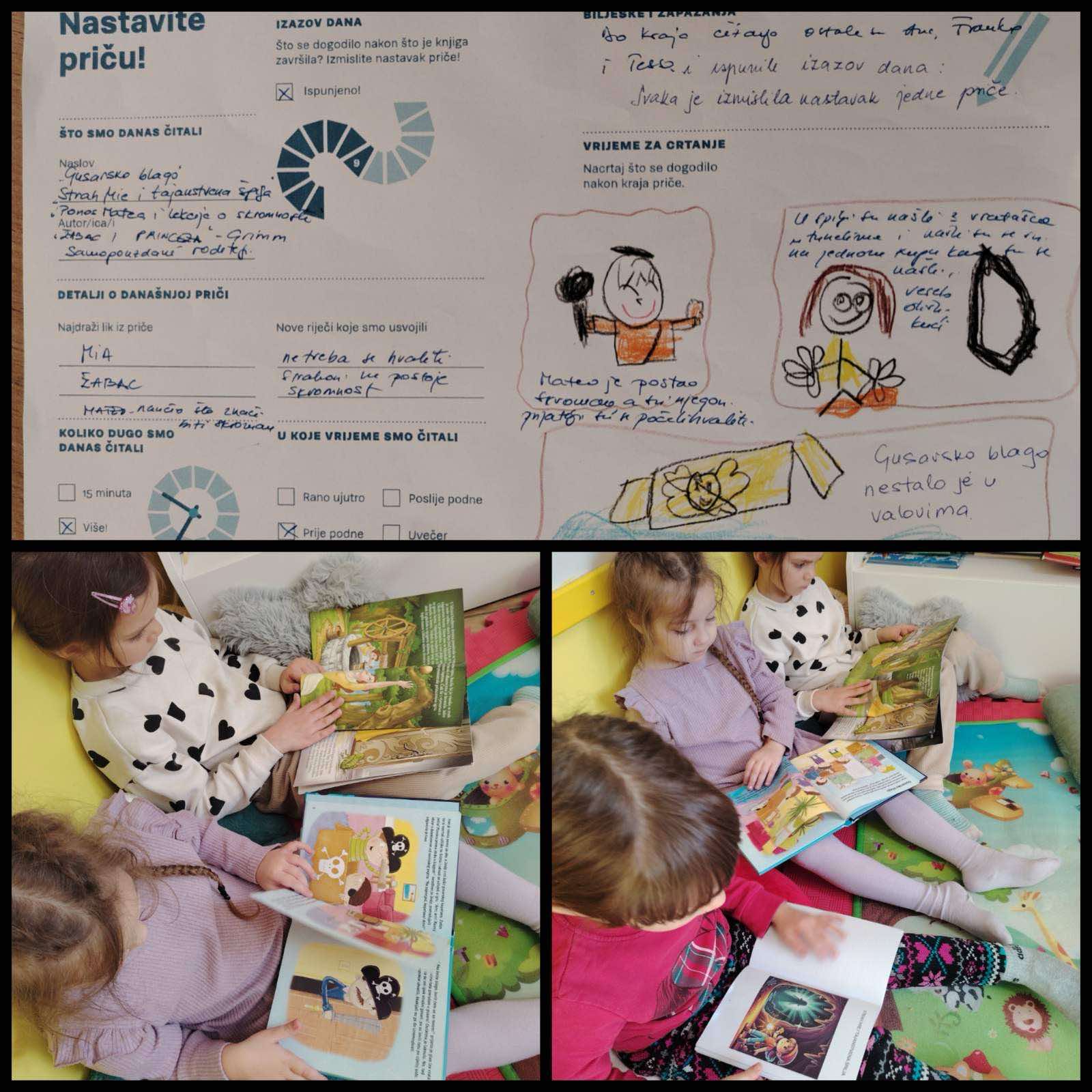 Nakon svakog čitanja ispunjavali smo Dnevnik čitanja te razgovarali o likovima, tijeku radnje, osobinama likova i porukama koje priče prenose. Na taj smo način poticali razvoj jezika, razumijevanje pročitanog i izražavanje dječjih misli i osjećaja.
