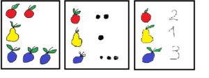 Pridruživanje brojevnih riječi količini je pravo brojenje. Brojimo stube, korake, kockice, sve što se ponavlja. U svakodnevnim situacijama prebrojavajte i komentirajte stvari u okolini (npr. uzeo sam dvije banane). Dok pripremate ručak ili užinu, komentirajte s djetetom što činite (npr. Stavljam dva krumpira u vodu. Naranču režem na pola). Prebrojavajte korake od ljuljačke do klackalice i od klackalice do tobogana. Igrajte se trgovine i razmjene novca te različitih društvenih igara koje se baziraju na brojevima i prebrojavanju (Čovječe ne ljuti se, Bingo, Domino, Monopoly, UNO). Napravite liste o tome tko što voli od ukućana, prijatelja – nacrtajte grafikon (tko voli sladoled od čokolade, tko od jagode, a tko od vanilije – koliko je kojih, kojih je najviše?”) Možete napraviti statistiku za puno različitih pitanja, a grafikone prikazivati kockicama, crtežima i sl. Mjerite visinu i težinu ukućana – napravite metar i bilježite razlike (tko je teži, tko lakši, za koliko, koliko dijete treba narasti da bude kao…). Uključite dijete u aktivnosti kuhanja pa ga učite vagati, prepoloviti, sipati… U igrama kuhanja možete stvarati vlastite recepte. Na donjim slikama su primjeri recepata za djecu s različito razvijenim stupnjem predmatematičkih vještina. Prvi recept se odnosi na sparivanje – dijete mora po receptu staviti onoliko voća koliko je na slici. Drugi recept se odnosi na pridruživanje, dijete treba pridružiti onoliko komada svakog voća koliko ima točkica u receptu. Treći recept je primjeren djetetu koji poznaje znamenke i ima potpuno usvojen pojam broja.