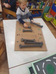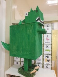 Igrali smo i razne igre poput: „Dinosaurov put do kuće“, „Složi kosti po veličini“, „Ulovi triceratopsa“, „Senzorni kovčeg s dinosaurima“, razne slagalice s geometrijskim oblicima, igra razvrstavanja: vodeni, kopneni i zračni dinosauri..
